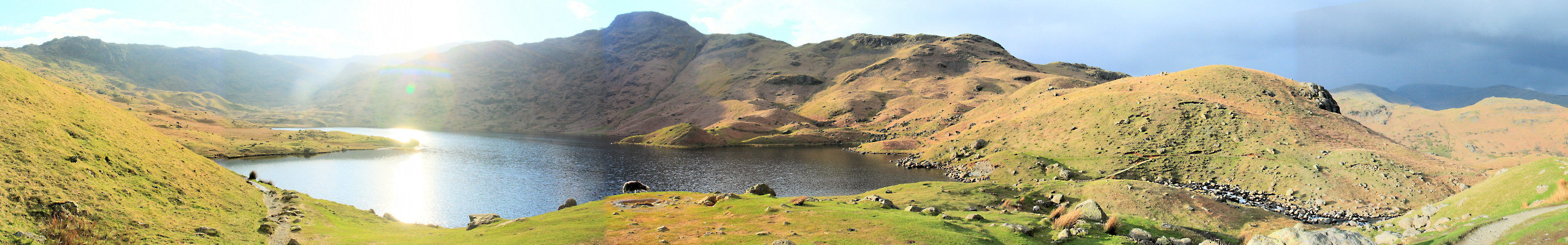 Another 'stitch' together of photos (five this time). Sorry about the joins; there was no time to move up the tarn to get the sun behind, so shooting into the sun was the only option.