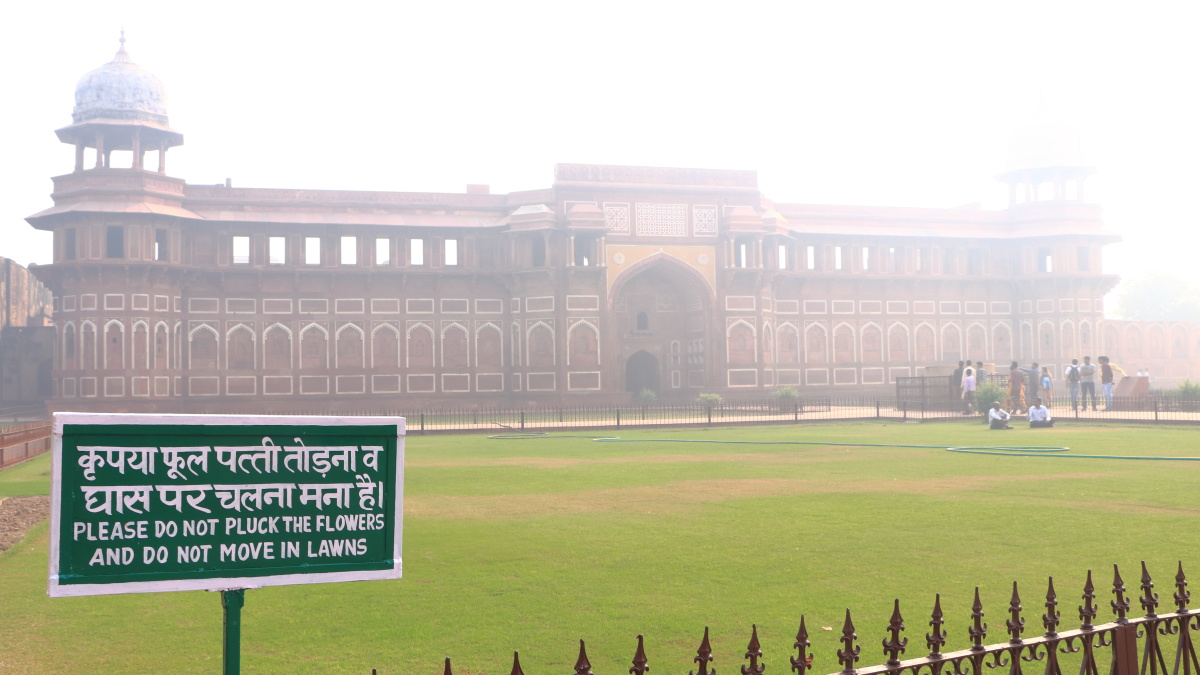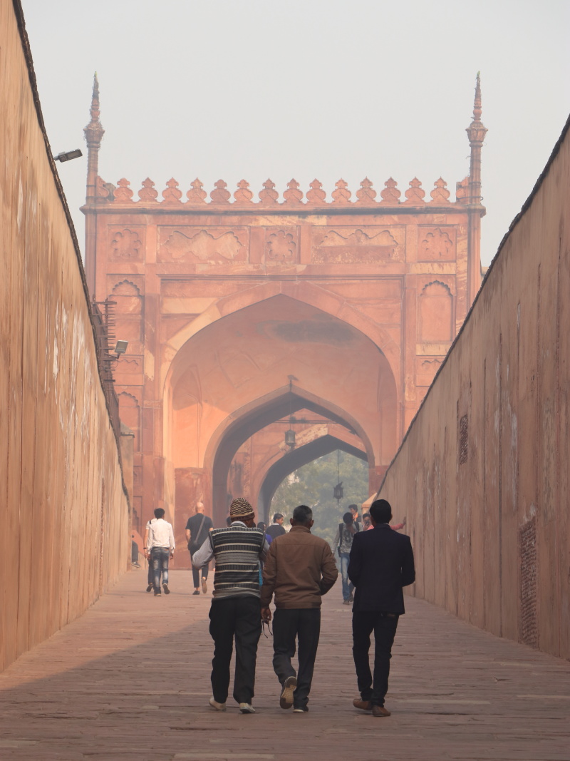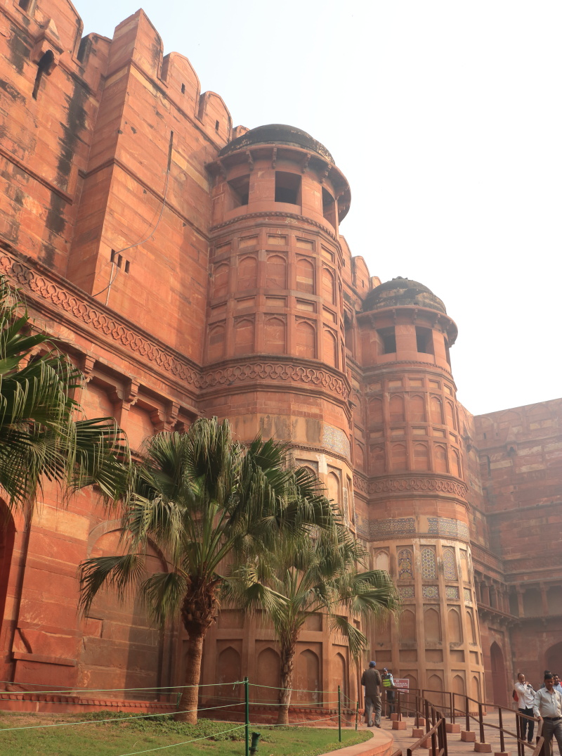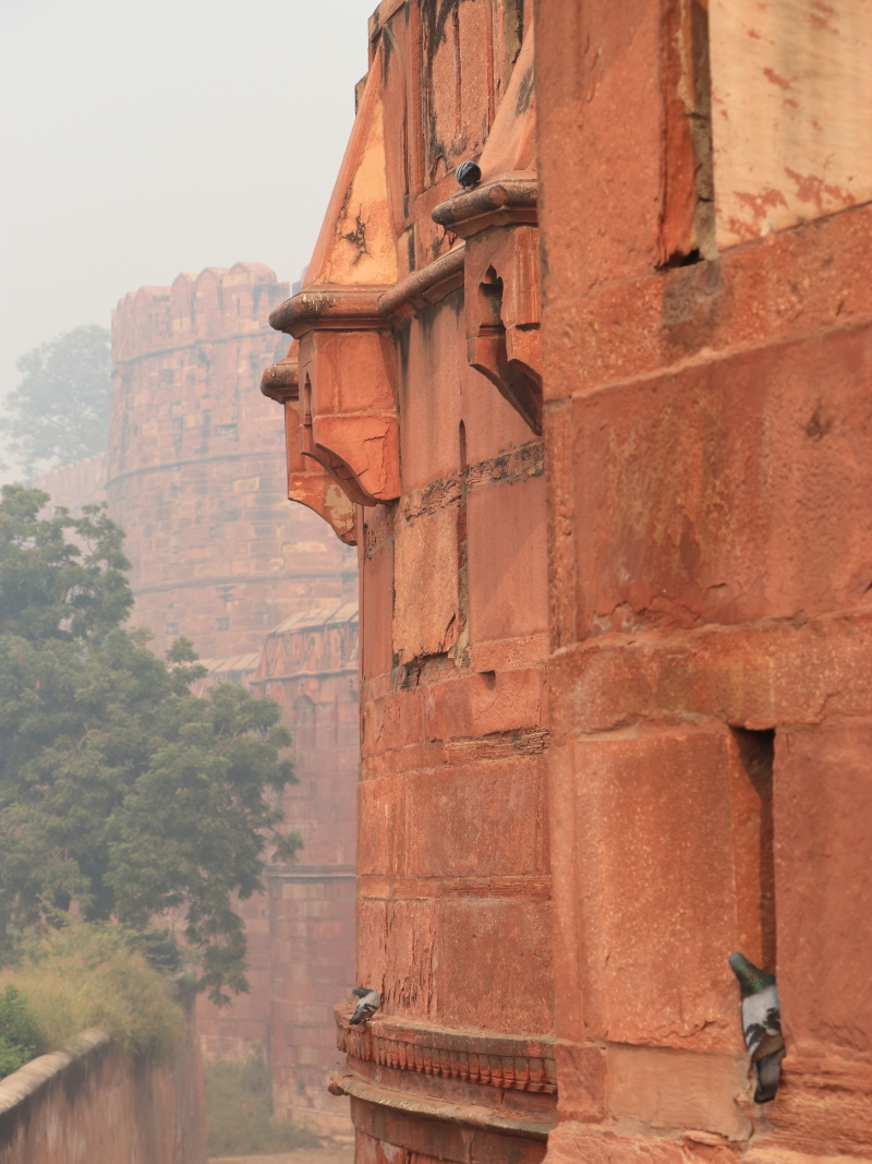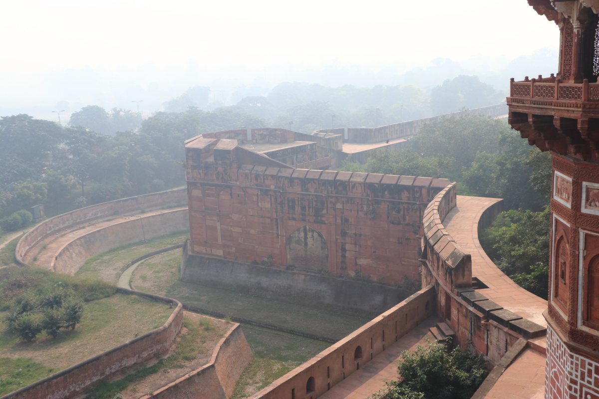 Although now drained, the deep moat was originally filled by water from the adjacent river Yamuna (lost in the haze).