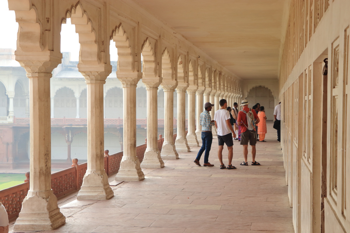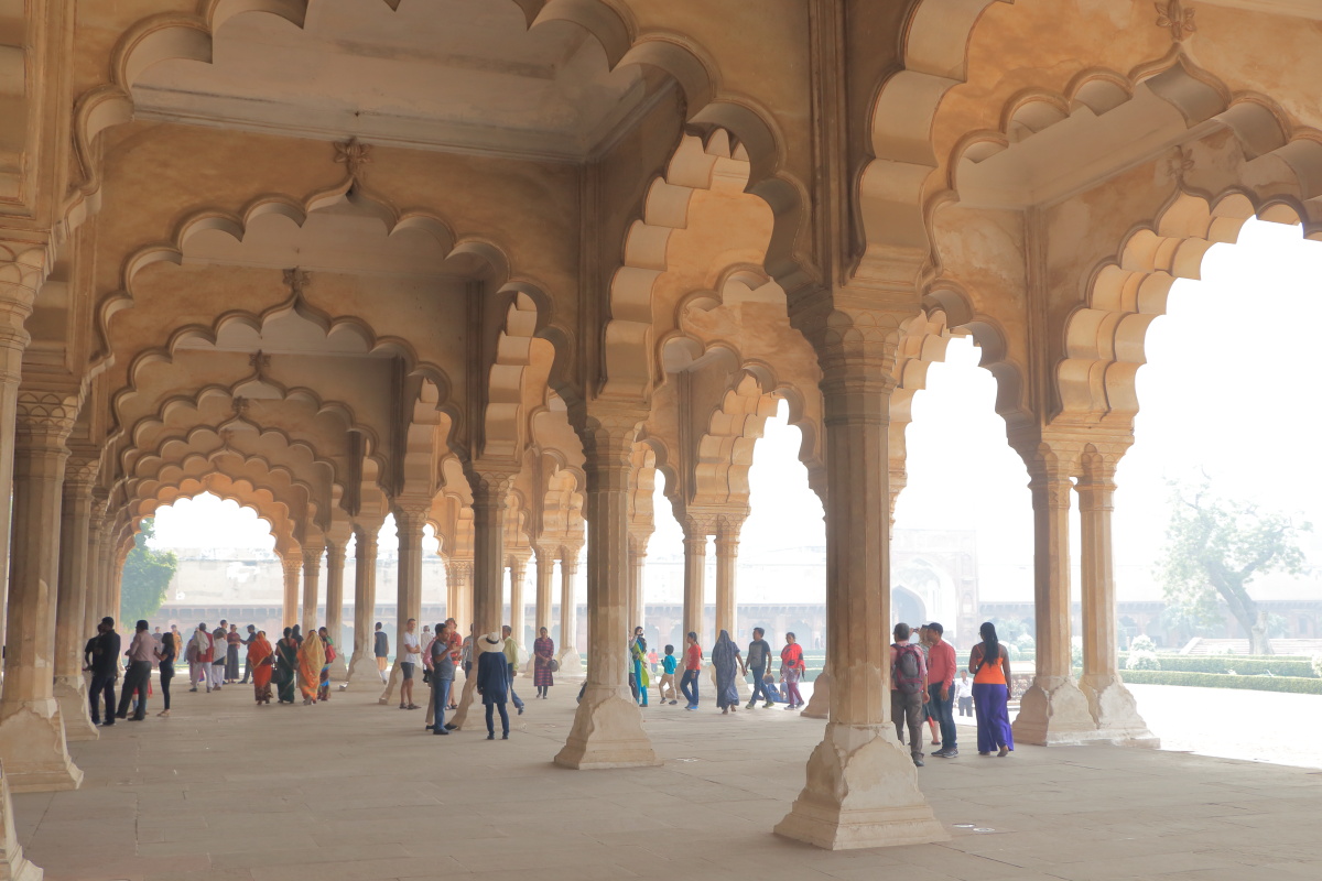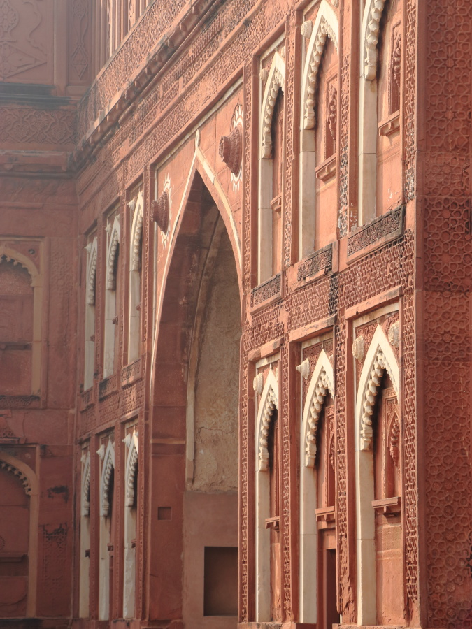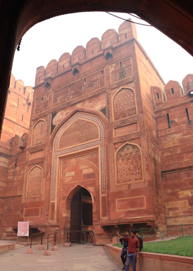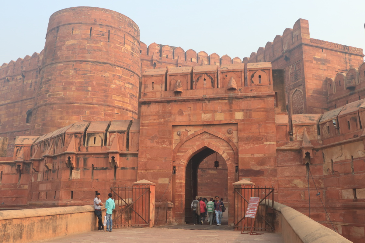 Although now drained, the deep moat was originally filled by water from the adjacent river Yamuna (lost in the haze).