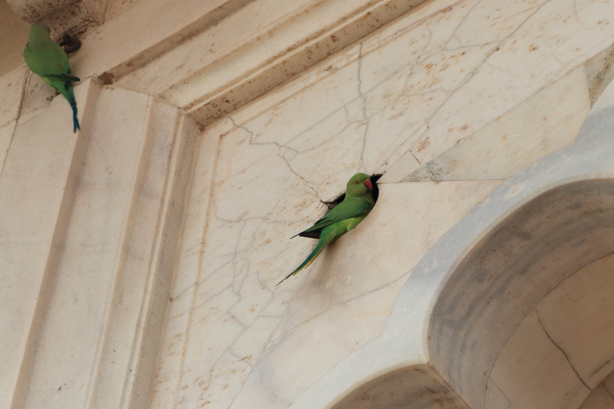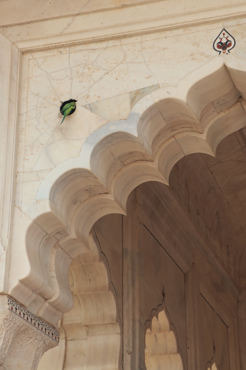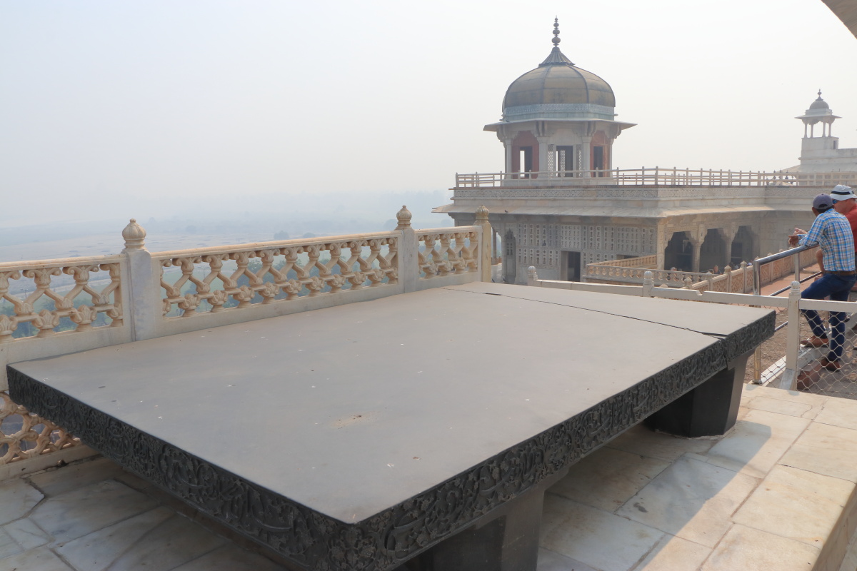 This is Jahangir's impressive throne, made of black onyx in 1605. The crack on the right is from a cannon ball fired by the East India Company in 1803. The ball bounced off the throne and made a hole in the wall oposite, making a great nest for a parokeet.